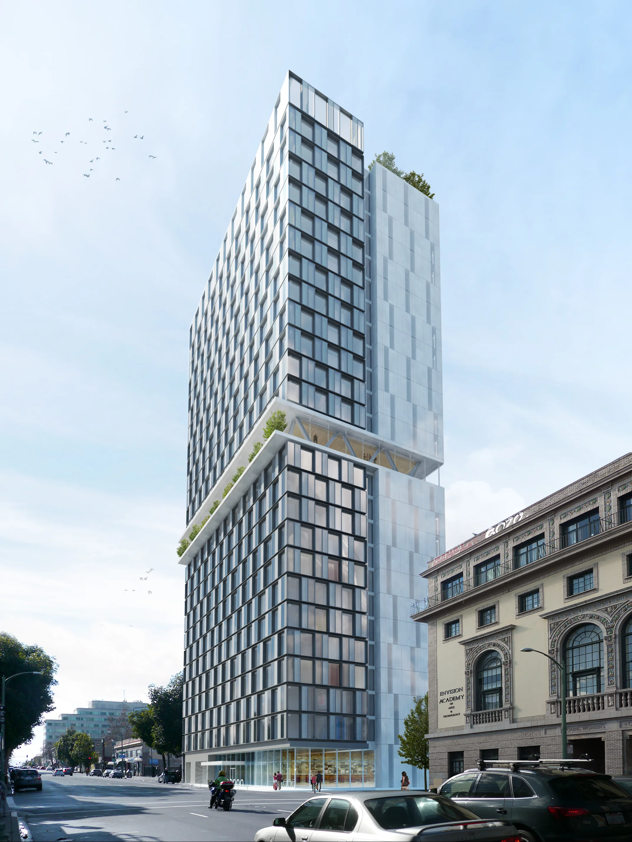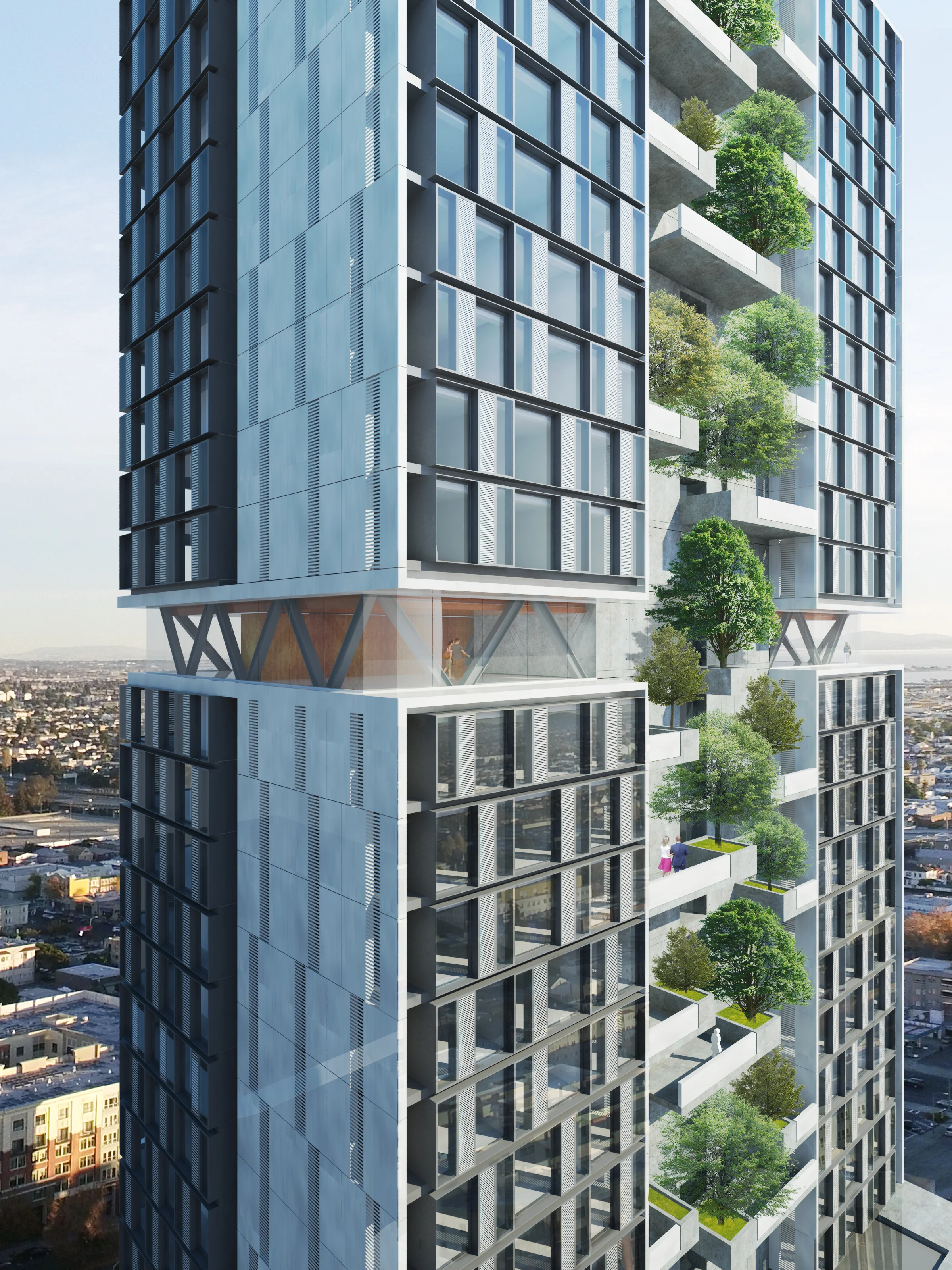 The elevator core is pushed to the rear of the building and is covered with a vertical garden of trees and balconies.
